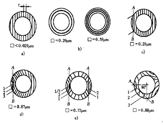 ① 图7-3所示的干涩条纹为直带,它是用光学平晶在钠光灯下检测到的。直带图像表明被测的平面度非常高,接近于理想平面,平面度偏差小于0.029um