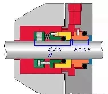 机封总是由旋转部件(黄色部分)和静止部件(橙色部分)两大部分组成,两相对运动的动,静环面成为密封的主密封面。