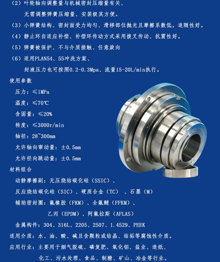 | 结构特点 | (1)散装式双端面、平衡型且双向承压、夹紧式传动 (2)叶轮轴向调整量与机械密封压缩量有关、无需调整弹簧压缩量、安装极其方便。 (3)小弹簧结构、密封面受力均匀、滑移部位抛光且摩擦系数低,追随性好。 (4)静止环自适应补偿、补偿环传动方式采用拨叉传动、抗震性好。 (5)弹簧被保护、不与介质接触、任意旋向 (6)适用PLAN54、55冲洗方案、封液压力也可按照0.2-0.3Mpa、流量15-20L/min执行。 |
