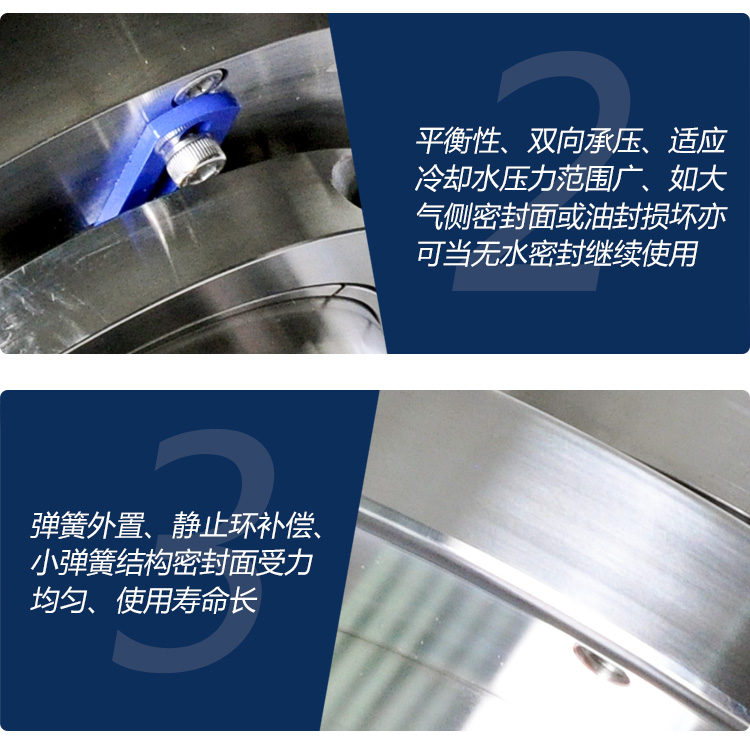 平衡性、双向承压、适应冷却水压力范围广、如大气侧密封面或油封损坏亦可当无水密封继续使用