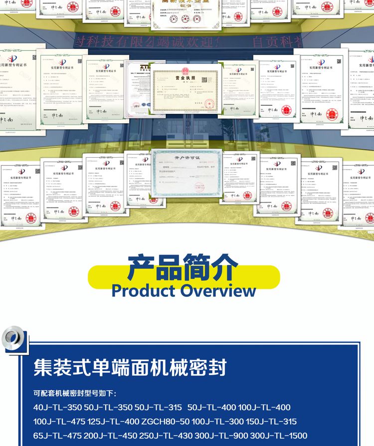 (1)集装式单端面、无冷却水密封、平衡型且单向承压、单轴套滑移式传动,叶轮轴向调整量与机械密封压缩量无关、无需调整弹簧压缩量、安装极其方便。