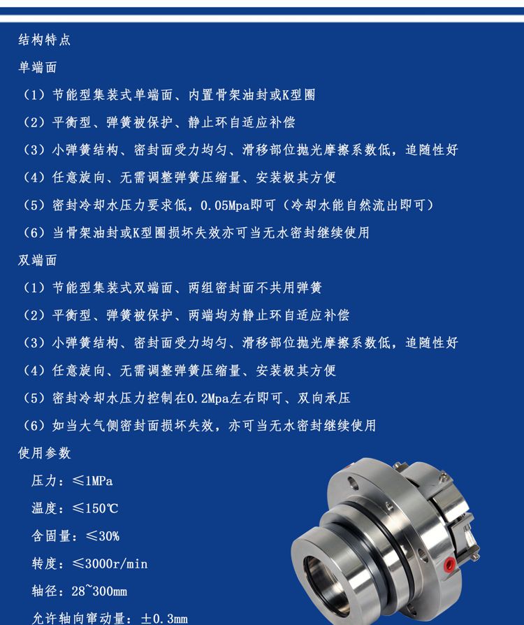 | 结构特点 | (1)节能型集装式单端面、内置骨架油封或K型圈 (2)平衡型、弹簧被保护、静止环自适应补偿 (3)小弹簧结构、密封面受力均匀、滑移部位抛光摩擦系数低,追随性好 (4)任意旋向、无需调整弹簧压缩量、安装极其方便 (5)密封冷却水压力要求低,0.05Mpa即可(冷却水能自然流出即可) (6)当骨架油封或K型圈损坏失效亦可当无水密封继续使用 |