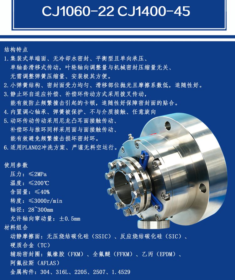 (1)集装式单端面、无冷却水密封、平衡型且单向承压、单轴套滑移式传动,叶轮轴向调整量与机械密封压缩量无关、无需调整弹簧压缩量、安装极其方便。