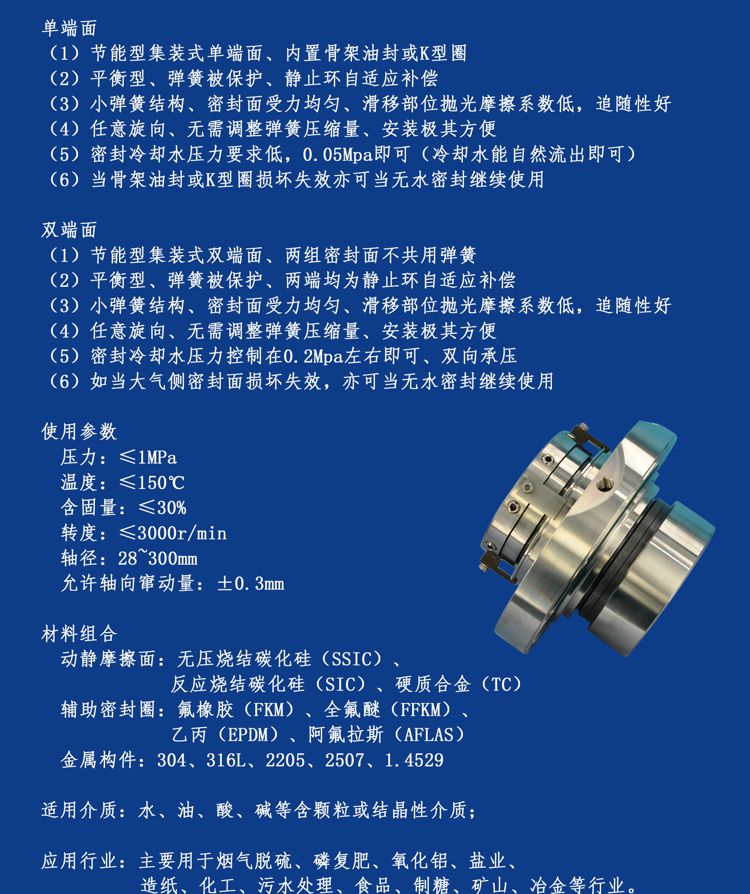 | 结构特点 | (1)节能型集装式单端面、内置骨架油封或K型圈 (2)平衡型、弹簧被保护、静止环自适应补偿 (3)小弹簧结构、密封面受力均匀、滑移部位抛光摩擦系数低,追随性好 (4)任意旋向、无需调整弹簧压缩量、安装极其方便 (5)密封冷却水压力要求低,0.05Mpa即可(冷却水能自然流出即可) (6)当骨架油封或K型圈损坏失效亦可当无水密封继续使用 |